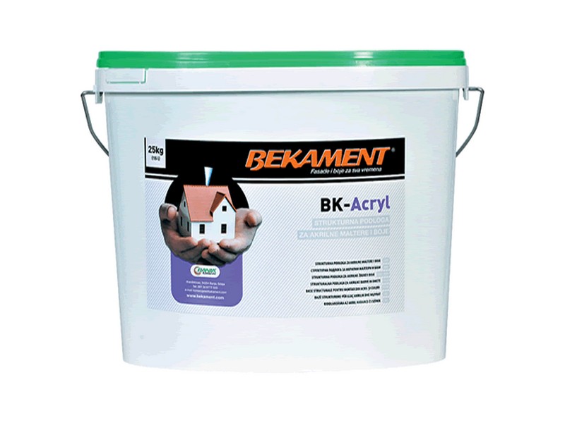 Akrilna strukturna podloga namenjena za ujednačavanje, neutralizaciju, učvršćivanje i vodoodbojnost podloge pre nanošenja akrilnih fasadnih boja i dekorativnih maltera. Preporučljivo je BK-Acryl podlogu tonirati u nijansi završnog sloja fasade. Podloga na koju se BK-Acryl nanosi mora biti čvrsta, čista, suva i bez ostataka ulja. BK-Acryl podlogu pre upotrebe promešati i razrediti sa 15-20% vode. Podloga se najčešće nanosi dugodlakim valjkom ili četkom u jednom sloju. Može se koristiti u enterijerima i eksterijerima. Vreme sušenja je minimum 24 h. Vreme sušenja pri normalnim uslovima (T=+23-25 ºC, relativna vlažnost vazduha=50-60 %), pre nanošenja boje ili maltera iznosi min. 12 h. Temperatura vazduha i podloge prilikom ugradnje treba da bude u opsegu od +5 ºC do +30 ºC. Ne raditi po direktnom suncu, kiši i jakom vetru. Visoka vlaga i niske temperature mogu znatno produžiti vreme sušenja. Rok trajanja: Do 18 meseci, u originalno zapakovanoj ambalaži. Skladištiti na temperaturi od +5 do +25 stepeni, zaštićeno od sunčeve svetlosti i smrzavanja. Potrošnja Oko 0,2–0,25 kg/m2 u zavisnosti od upijanja i hrapavosti podloge.